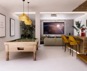 Las ventanas estratégicamente ubicadas en el sótano proporcionan una abundancia de luz natural, y los compradores pueden personalizar el tamaño de las habitaciones según sus necesidades. Actualmente, el plan del sótano incluye 2 habitaciones y un gran cine en casa, pero una de las habitaciones se puede reemplazar por un cine o sala de juegos más espaciosa. La piscina complementa armoniosamente la villa, creando la impresión de que la luz azul reflejada brilla a través de esta exquisita propiedad.