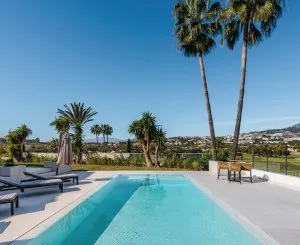 Rodeada de vegetación subtropical y propiedades de lujo de Nueva Andalucía, la residencia orientada al norte de 404 m² ha sido recientemente reformada utilizando materiales de alta calidad. Ubicada en uno de los mejores y más grandes (¡1.923 m²!) terrenos en Los Naranjos, ofrece abundancia de espacio y exclusividad. Garantizando un amplio espacio y comodidad para todos, esta casa cuenta con 5 amplios dormitorios y 7 baños, una cocina totalmente equipada, áreas de estar y comedor, terrazas y mucho espacio para relajarse y entretenerse. Una gran suite principal completa con vestidor y una sección de estudio adyacente para mayor comodidad, tiene su propio piso separado. Puede mejorar su rutina de ejercicios en un gimnasio ubicado en un nivel intermedio y que ofrece impresionantes vistas del campo de golf. Adéntrate en un exuberante jardín con un sistema de riego automático y una impresionante variedad de plantas, creando un refugio al aire libre cautivador y vibrante. Relájate durante todo el año con estilo con una piscina climatizada y un jacuzzi incorporado.