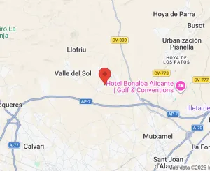 Ubicadas a las afueras de Mutxamel, en la zona conocida como Valle del Sol - Rio Park, una zona tranquila de viviendas similares, bien comunicada por carretera con el centro de la ciudad y todo tipo de comercio y servicios.