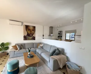 La luminosa cocina de concepto abierto y el salón conducen a la terraza, al jardín y a la piscina comunitaria. Todas las habitaciones tienen aire acondicionado. Aparcamiento privado incluido.