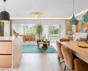 Cette magnifique villa de plain-pied, située dans le quartier paisible d'Elviria, offre une combinaison parfaite de charme espagnol traditionnel et de design moderne. Rénovée en 2022, la villa s'étend sur 1 100 mètres carrés de terrain et dispose de trois chambres spacieuses, dont une suite principale avec salle de bain privative et douche extra-large. La cuisine ouverte, équipée d'appareils haut de gamme, mène à une salle à manger élégante, tandis que le salon offre une vue sur le jardin luxuriant et la piscine à eau salée.