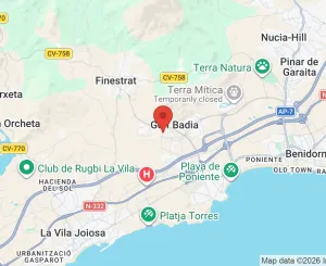 Located in the Golf Bahía urbanization, 5 minutes from Finestrat and 10 minutes from Benidorm, its beaches and shopping centers. Quick access to the AP7 highway that connects the entire Mediterranean coast.
