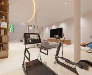 Dressed in white with hints of wood, which go hand in hand, creating a captivating visual play of textures. Simplicity of silhouette, a wise combination of materials, and harmony with the natural environment. Celebrating a peaceful life. This is a functional space that allows you to enjoy everything, from a private gym to relaxing on the couch before watching a movie.