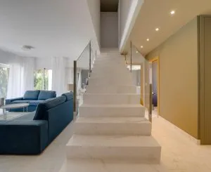 Blancos Thasos stairs with custom made steps with stainless steel handrails with safety glass