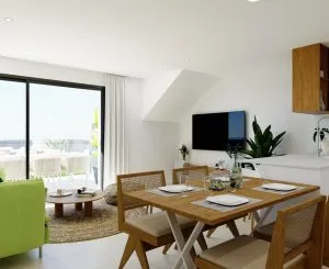 Бунгало на верхнем этаже новостройки имеет 2 спальни, 2 ванные комнаты, кухню открытого плана с просторной гостиной, встроенные шкафы, террасу, частный солярий и подземное парковочное место.